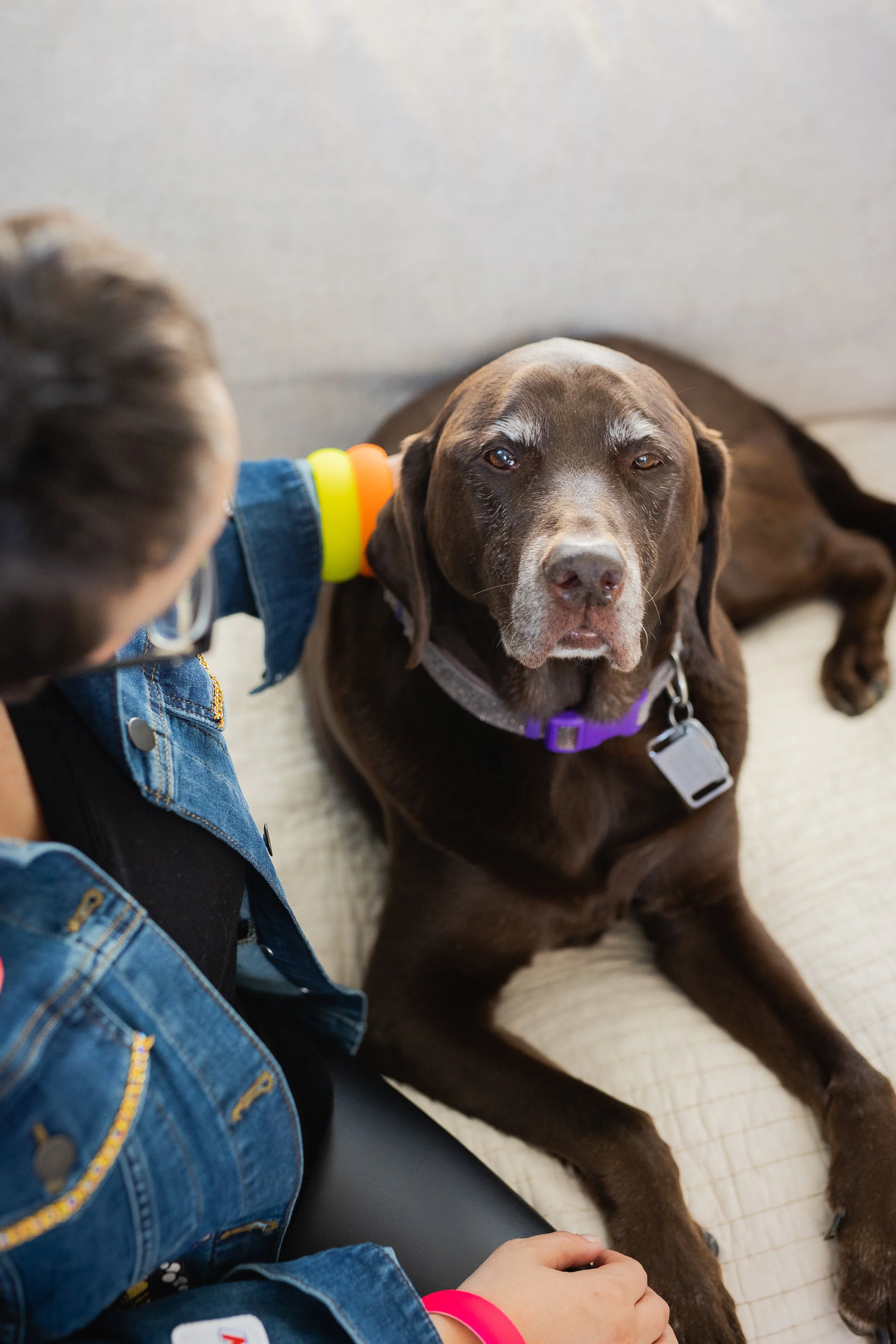 Roxy's favorite color is purple and she has an unhealthy obsession with peanut butter. Often referred to as our “supervisor” and/ or our “home security system,” she is incredibly spoiled. Roxy will be 14 years old as of February 2025, and our whole house is designed around making sure she’s comfortable - she's the star of the show and knows it.